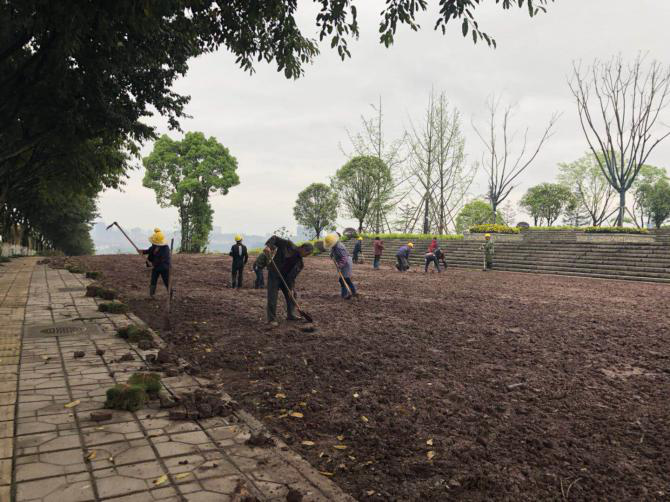 兩江建設公司組織100余工人 連續搶工兩江新區綠化工程