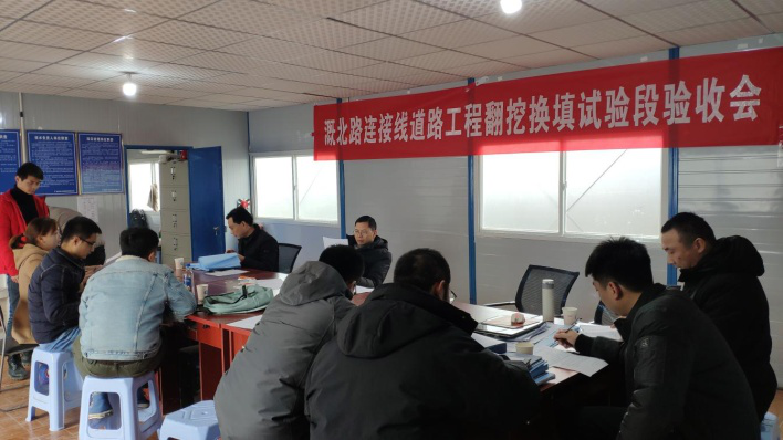 與會人員按程序對翻挖換填試驗段的現(xiàn)場施工質量情況進行了詳細察看;隨后,在溉北路連接線道路工程項目部現(xiàn)場辦公室對其質量進行了客觀評定。