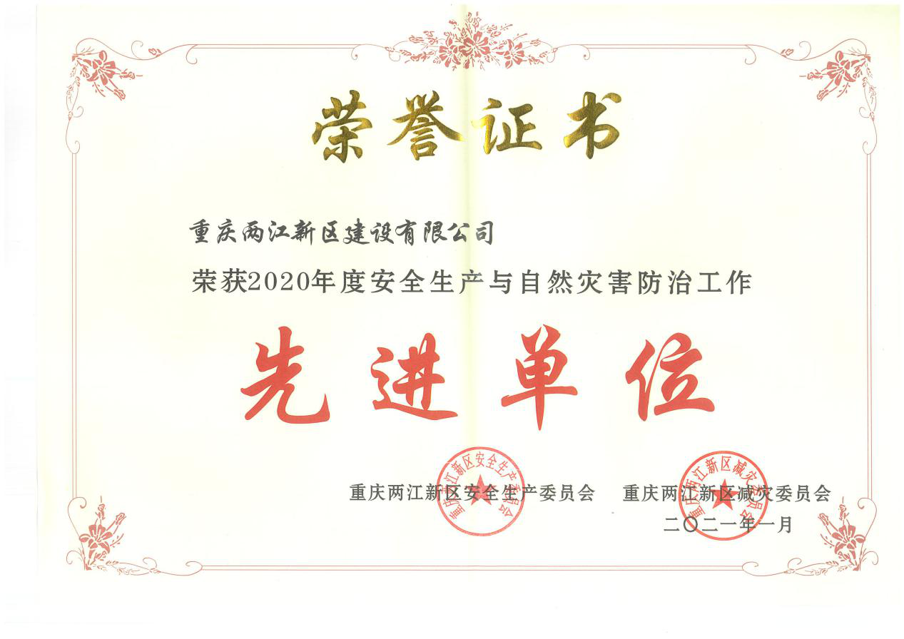 兩江建設公司榮獲“兩江新區2020年度安全生產與自然災害防治工作先進單位”榮譽稱號