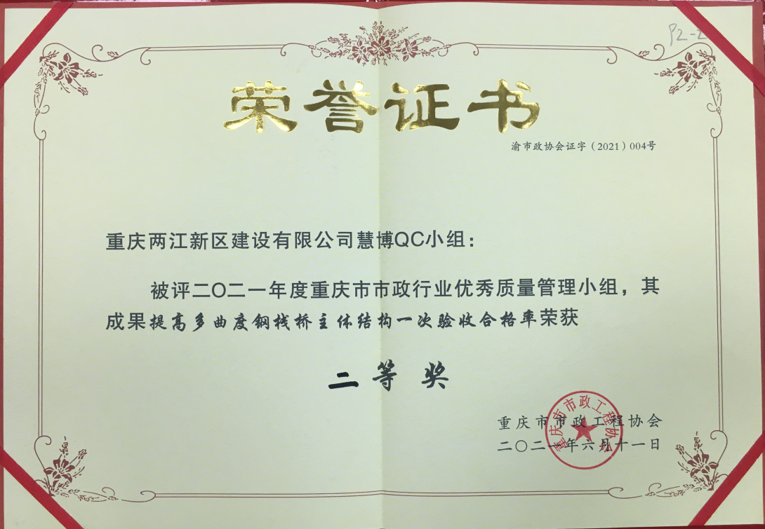 來源:總工辦 林彬 發(fā)布日期:2021/6/17 【打印此文】近日,兩江建設公司充分發(fā)揮質(zhì)量創(chuàng)新技術(shù)在市政行業(yè)項目的支撐作用,在市政工程項目現(xiàn)場中開展了大量的質(zhì)量管理小組活動,解決了市政工程中的難題,創(chuàng)造出了一些有價值、有創(chuàng)新、有技術(shù)的質(zhì)量QC成果,其中公司兩江新區(qū)禮嘉智慧公園二期慧博QC小組的“提高多曲度鋼棧橋主體結(jié)構(gòu)一次驗收合格率”成果榮獲了2021年度重慶市市政行業(yè)優(yōu)秀質(zhì)量管理小組二等獎,重慶北站南廣場改造項目先鋒號QC小組的“提高大型交通樞紐改造項目天棚管道安裝一次性驗收合格率”成果榮獲2021年度重慶市市政行業(yè)優(yōu)秀質(zhì)量管理小組三等獎。
