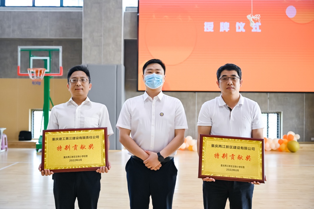 云錦小學(xué)由兩江建設(shè)公司代理建設(shè),在工期極為緊張的情況下公司領(lǐng)導(dǎo)和代建部長(zhǎng)期奮戰(zhàn)在施工第一線,特別是在惡劣環(huán)境下采取了肩挑背扛的方式,最后同施工單位一起在保證質(zhì)量和安全的情況下按時(shí)完成學(xué)校建設(shè),因此云錦小學(xué)校為兩江建設(shè)公司授予特別貢獻(xiàn)獎(jiǎng)。公司丁總對(duì)學(xué)校的認(rèn)同表示感謝,也祝愿云錦小學(xué)越來(lái)越好。