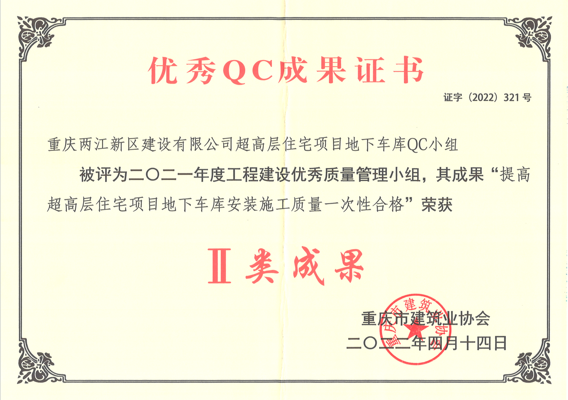 近日,在兩江建設公司各級領導的大力支持下,按照全國建筑業企業質量管理小組“求真務實、落實標準、穩步提升”活動主題內容精神,在項目中自主開展了群眾性的質量管理小組活動,使兩江建設公司的QC小組活動又有了新的發展。兩江建設公司重慶市溉瀾溪(B02-3/02地塊)工程的超高層住宅項目地下車庫QC小組“提高超高層住宅項目地下車庫安裝施工質量一次合格”成果,榮獲了2021年度重慶市工程建設優秀質量管理小組Ⅱ類成果獎項。