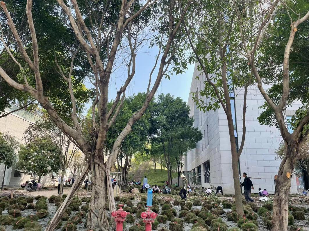 由于對院區內進行美化改造的時間緊迫,兩江建設公司安排近200余人搶工突擊,栽植草皮、完成修枝和清理工作。兩江建設公司科學組織,在搶工的同時也綜合考慮天氣因素,根據植物不同的使用功能和性質進行科學設計,合理布局,滿足植物各自生長所需的產地條件,合理栽植,精心組織實施,提高成活率,同時派專人進行養護管理。做到種一棵活一棵,種一片活一片。
