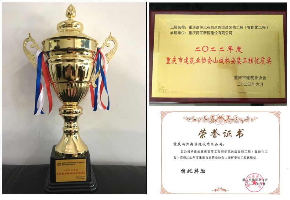 近日,由兩江建設(shè)公司承建的重慶高等工程師學(xué)院改造裝修工程(智能化工程)榮獲2022年度重慶市安裝工程最高獎項(xiàng)——山城杯安裝工程優(yōu)質(zhì)獎。