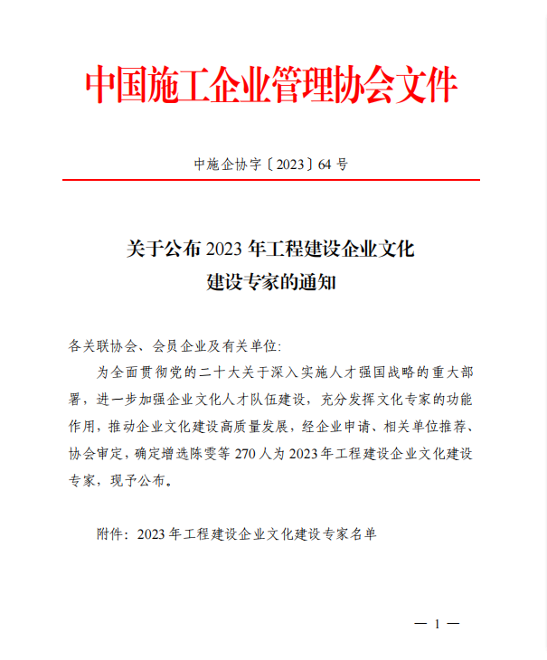 近日,中國(guó)施工企業(yè)管理協(xié)會(huì)發(fā)布了《關(guān)于公布 2023 年工程建設(shè)企業(yè)文化建設(shè)專家的通知》,重慶兩江新區(qū)建設(shè)有限公司公司監(jiān)事會(huì)主席張青同志受聘“工程建設(shè)企業(yè)文化建設(shè)專家”。