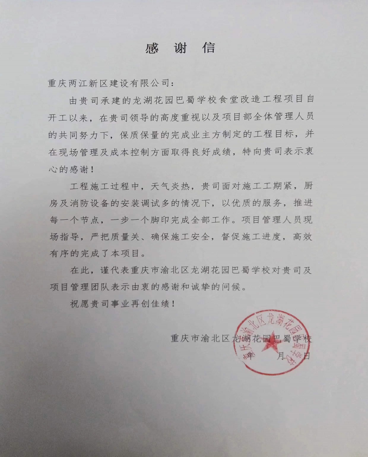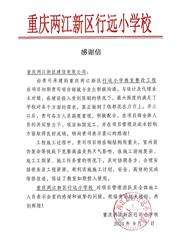 這一封封感謝信,不僅是對兩江建設公司工作的肯定,更是公司后續工作的強勁動力。接下來,我司將繼續為促進兩江新區教育事業高質量發展貢獻自己的一份力量。
