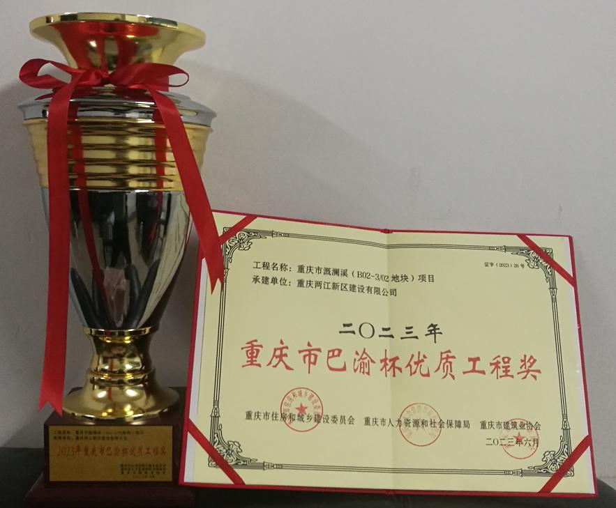 為樹立典型,進一步引導激勵廣大建筑業企業以及建設者奮進新征程、建功新時代、建設新重慶,營造“百年大計、質量第一”氛圍,推動全市建筑業高質量發展,由市住建委、市人社局、市建協三部門對全市建造出一大批優質精品工程進行了層層嚴格篩選。最后,由兩江建設公司承建的重慶市溉瀾溪(B02-3/02地塊)項目榮獲了“2023年重慶市巴渝杯優質工程獎”,該獎項為全市工程最高獎項。