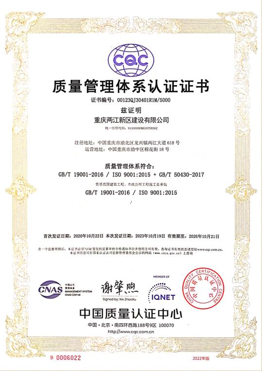兩江建設公司成功取得中國質量認證中心CQC再認證