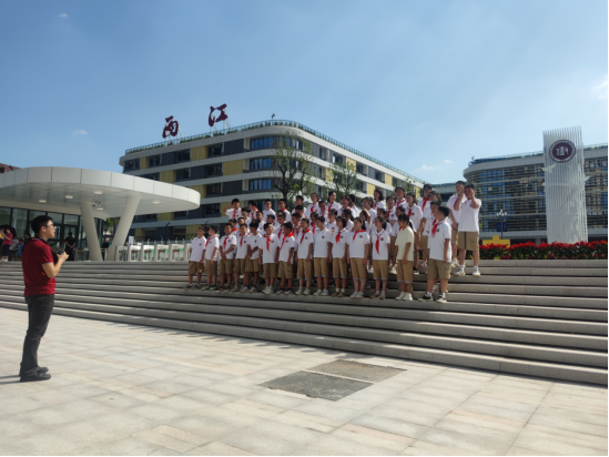 (剛踏入新階段的孩子們由教師帶隊在學校精神豐碑下合照留影)