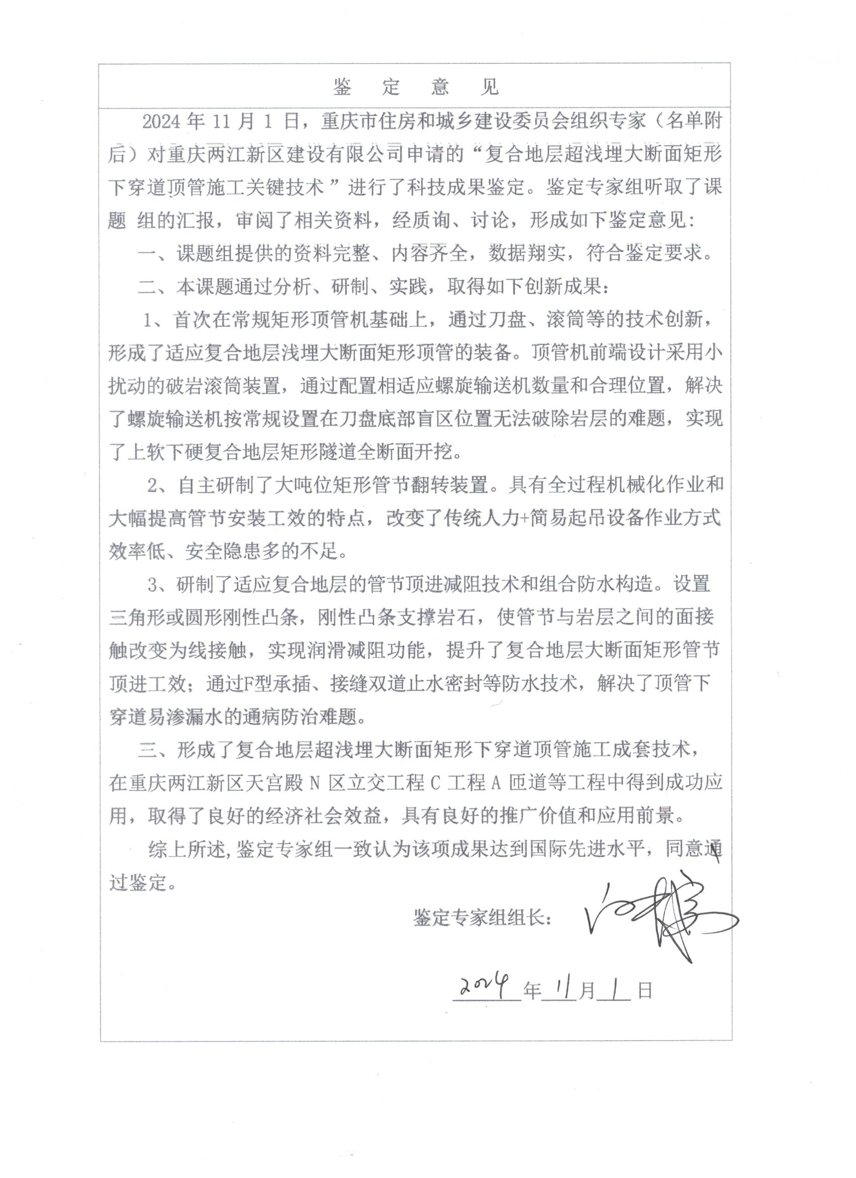 鑒定結(jié)果表明,公司自主研發(fā)的“復(fù)合地層超淺埋大斷面矩形下穿道頂管施工”重慶市工程建設(shè)關(guān)鍵技術(shù)成果達(dá)到了國(guó)際先進(jìn)水平,為公司探索“科技興企,轉(zhuǎn)型發(fā)展”破解建筑行業(yè)發(fā)展難題指明又一個(gè)新的思路和方向,其作用和意義重大且深遠(yuǎn)——公司在地下工程建設(shè)領(lǐng)域的科技創(chuàng)新和技術(shù)攻關(guān)取得重大突破的同時(shí),不僅提升了公司在行業(yè)內(nèi)的競(jìng)爭(zhēng)力和影響力,還有助于推動(dòng)本市建筑行業(yè)的技術(shù)進(jìn)步,為行業(yè)內(nèi)的其他企業(yè)提供可借鑒的先進(jìn)經(jīng)驗(yàn)和技術(shù)支持。