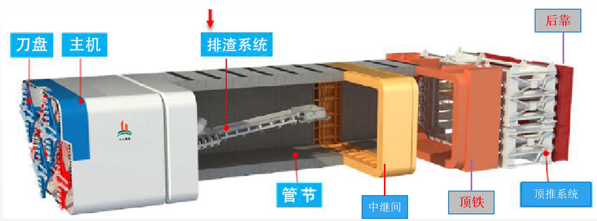 1.首次在常規(guī)矩形頂管機(jī)基礎(chǔ)上,通過刀盤、滾筒等的技術(shù)創(chuàng)新,形成了適應(yīng)復(fù)合地層淺埋大斷面矩形頂管的裝備。頂管機(jī)前端設(shè)計(jì)采用小擾動(dòng)的破巖滾筒裝置,通過配置相適應(yīng)螺旋輸送機(jī)數(shù)量和合理位置,解決了螺旋輸送機(jī)按常規(guī)設(shè)置在刀盤底部盲區(qū)位置無法破除巖層的難題,實(shí)現(xiàn)了上軟下硬復(fù)合地層矩形隧道全斷面開挖。