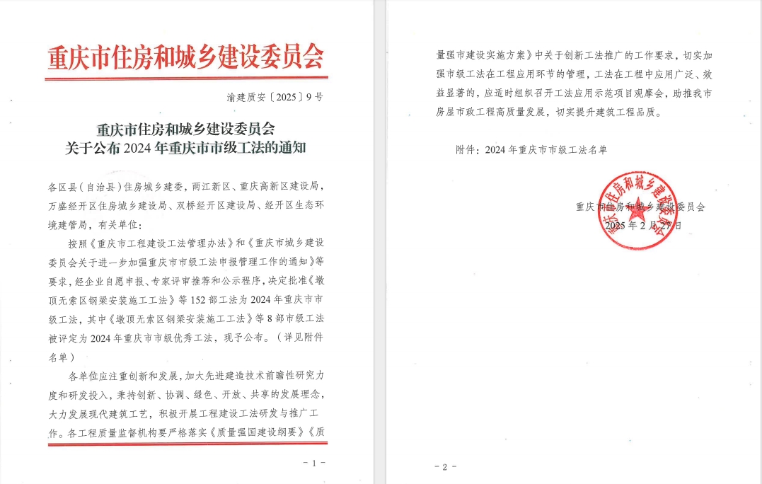 來源:圖文/總工辦 林彬 發布日期:2025/3/18 【打印此文】近日,兩江建設公司在施工技術領域取得重大突破,其創新的《超大斷面裝配式下穿矩形頂管施工工法》(CQSJGF045-2024)市級工法成功獲得推廣應用,這不僅提升了項目的工程質量,還進一步擦亮了兩江建設公司企業品牌,為行業發展樹立了新標桿。