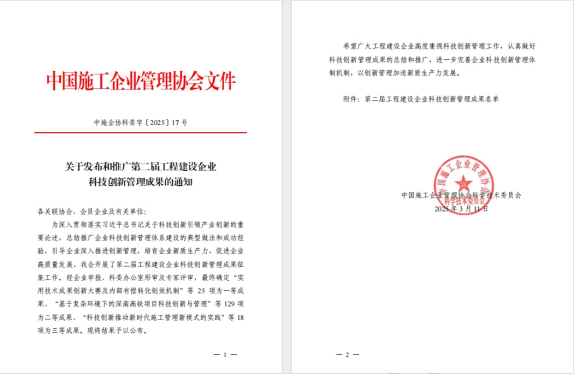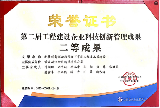 近日,由中國(guó)施工企業(yè)管理協(xié)會(huì)主辦的“2025年工程建設(shè)行業(yè)科技工作會(huì)議”在成都召開(kāi)。會(huì)上公布了中施企協(xié)科技專(zhuān)家名單和工程建設(shè)企業(yè)創(chuàng)新管理成果。兩江建設(shè)公司申報(bào)的“科技創(chuàng)新驅(qū)動(dòng)超淺埋下穿道工程高品質(zhì)建設(shè)”榮獲第二屆工程建設(shè)企業(yè)科技創(chuàng)新管理二等成果,公司副總經(jīng)理陳閣琳入選中施企協(xié)科技專(zhuān)家。
